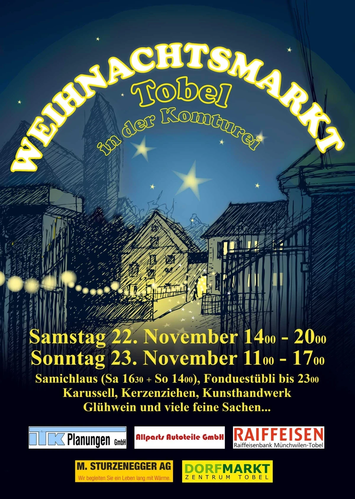 Auch dieses Jahr ist das Dorfmarkt-Zentrum Tobel am Weihnachtsmarkt in der Komturei mit einem Stand vertreten. Wir bieten Pilgerkäse mild und rezent zum Degustieren und Kaufen an. Dieser Käse wird in der Bergkäserei Mühlrüti produziert. Ausserdem gibt es wieder unsere beliebten Focaccia-Brötli, gefüllt mit Schinken, Käse und einem Spiegelei. Wir freuen uns über einen Besuch an unserem Stand.